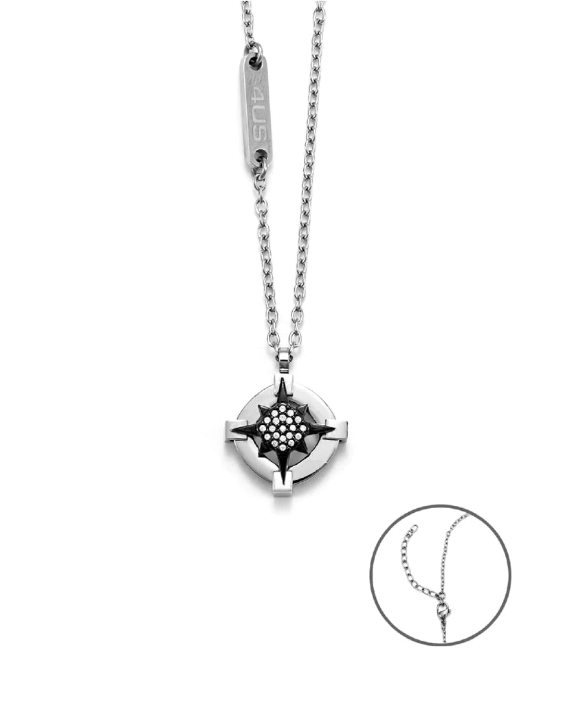 Collana girocollo della collezione 4US Cesare Paciotti da uomo. Colore: argento e nero. Il gioiello è in acciaio inossidabile 316L con trattamento pvd nero caratterizzato da un pendente a forma di rosa dei venti nera con zirconi bianchi. Lunghezza regolabile da 50 cm a 55 cm con chiusura a moschettone.Codice:4UCL5577