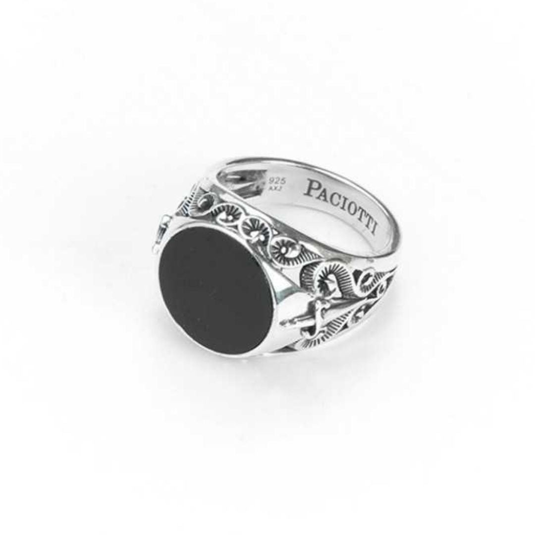 Cesare Paciotti anello da uomo in argento decorato modello sigillo con onice nero della collezione Relief di Paciotti Jewels