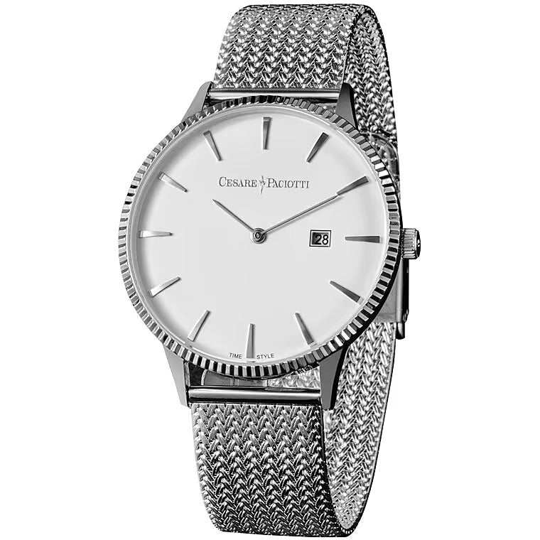 Orologio solo tempo da uomo di Cesare Paciotti della collezione tight. Modello in acciaio, con cassa slim della dimensione di 42mm. Orologio di colore bianco e argento. Questo modello ha cinturino in maglia milano con chiusura coulisse. Orologio con indici a bastoni, movimento miyota gm15 e datario. La resistenza all'acqua è di 3 atm.