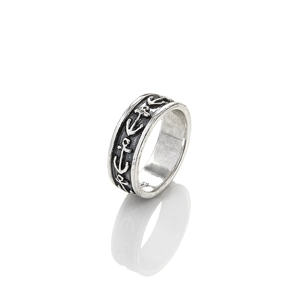 Anello da uomo realizzato in argento 925 con dettagli a forma di ancora, simbolo di stabilità e forza. La lavorazione artigianale garantisce qualità e durabilità nel tempo.