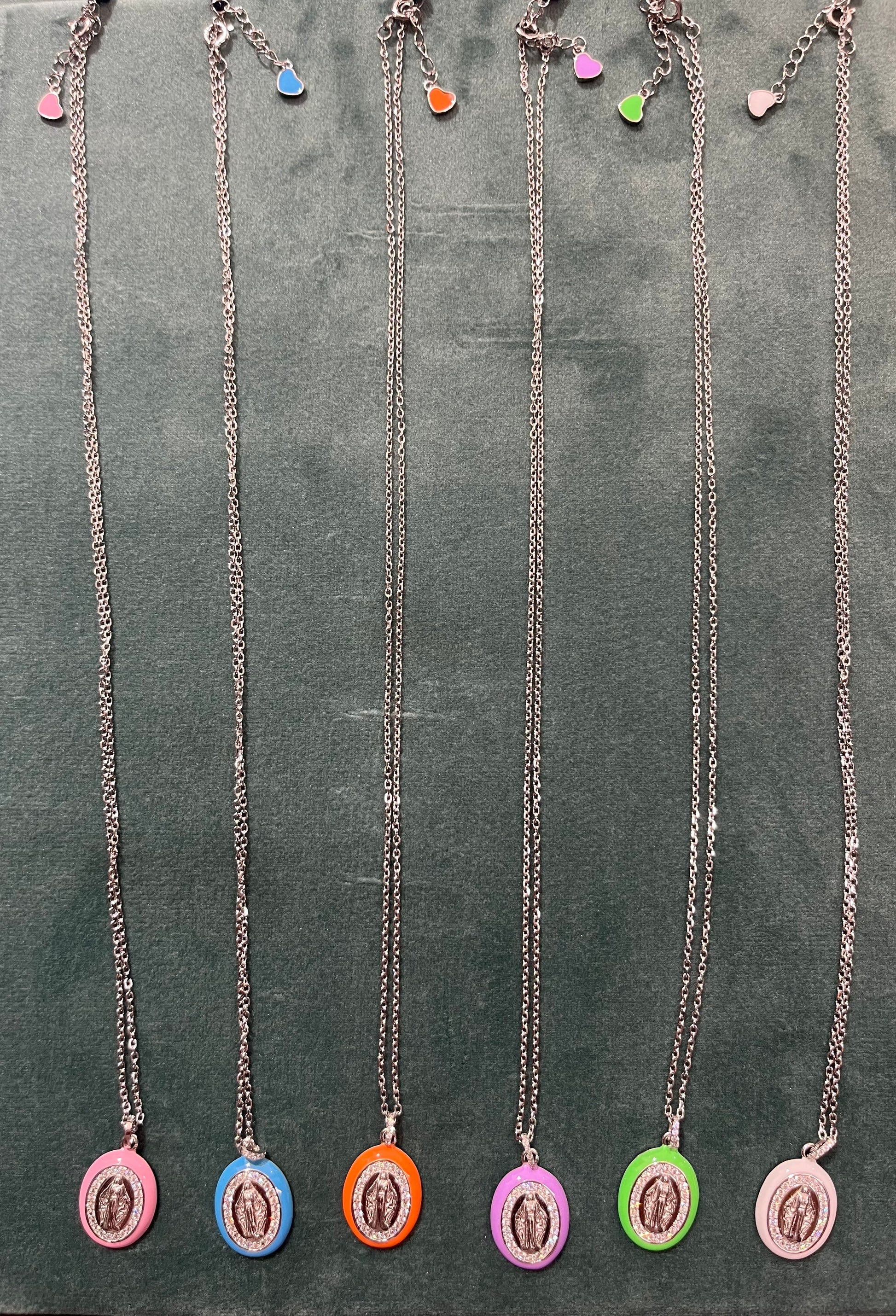 Collana in argento finemente lavorata, con pendente raffigurante la Madonna Miracolosa. Il bordo del medaglione è delicatamente smaltato in vari colori, valorizzando i dettagli e conferendo un tocco di vivacità e raffinatezza al gioiello. Un pezzo sofisticato che unisce spiritualità e design artigianale di alta qualità.