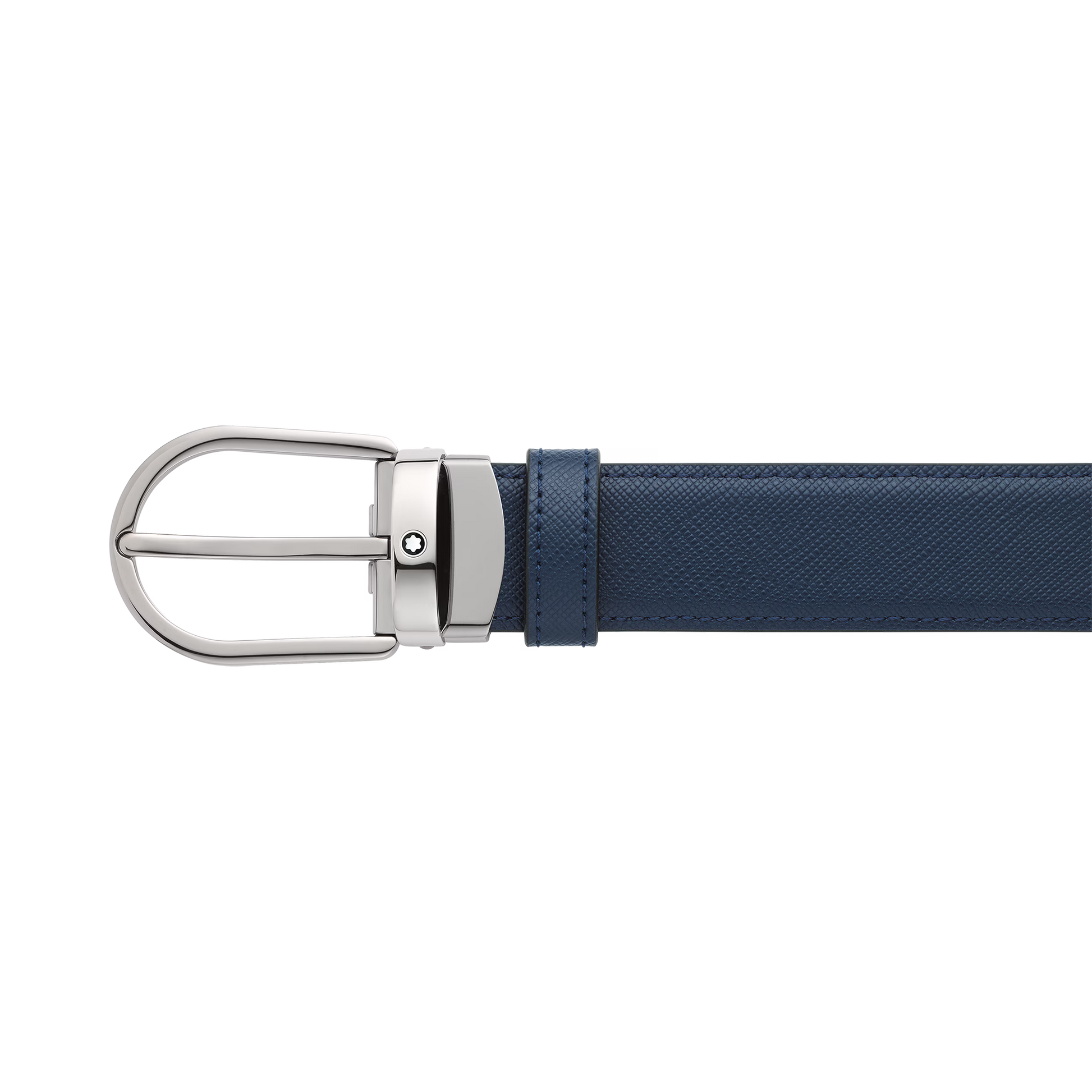Fibbia a ferro di cavallo finitura rutenio lucido. Cinghia auto-regolabile, 3 cm x 120 cm, reversibile in pelle stampa Saffiano nera e blu. Pensata per un look classico con un tocco in più.