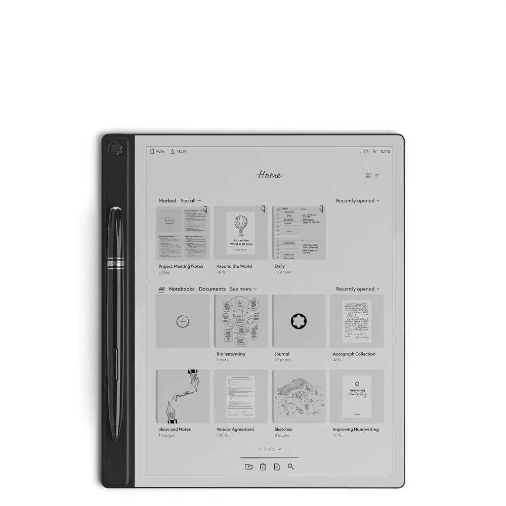 Set che comprende il tablet Montblanc Digital Paper, Montblanc Digital Pen dotato di una punta (tipo in lino), 2 punte aggiuntive (liscia e opaca), cavo USB-C, manuale di sicurezza con scheda di garanzia inclusa.