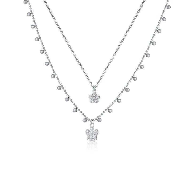 Collana doppia catena Roberto Giannotti che coniuga minimalismo consapevole e dettagli preziosi. Due charm distinti—un angelo simbolico illuminato da zirconi bianchi e un fiore romantico in cristallo—si susseguono su catene sottili e leggere, creando una composizione visiva armoniosa. La doppia struttura amplifica l'eleganza dei pendenti senza appesantire l'insieme. Gli zirconi garantiscono brillantezza costante nel tempo, mentre il design essenziale si rivela versatile con qualsiasi stile personale. Un gioiello sofisticato per chi ricerca accessori che combinano significato emotivo, bellezza formale e capacità di elevare ogni look con discrezione e classe.