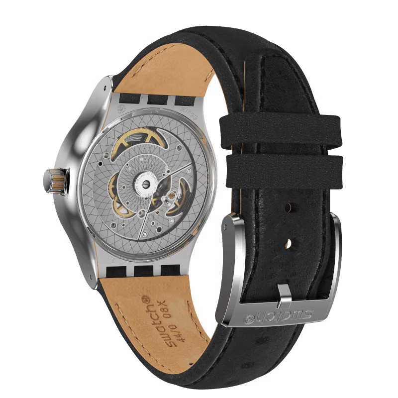 SISTEM51 riconferma la sua vocazione innovativa con PETITE SECONDE BLACK (SY23S400)! A ore 6, questo raffinato orologio meccanico ha un piccolo cronografo contasecondi. Una seconda apertura sul quadrante spazzolato nero è riservata alla finestra data. Il cinturino coordinato in pelle e i dettagli Swatch in nero ne completano il design elegante.